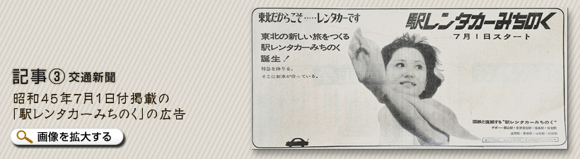 昭和45年7月1日、全国のトップ切って営業開始したのが、「駅レンタカーみちのく」と「駅レンタカー信州」の2社だ。これは、順調にスタートした1カ月間の動きをまとめた記事(記事【1】)と、そのオープンをPRする広告記事(記事【3】)だ。