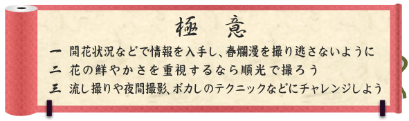 桜、菜の花に限りませんが、一番のポイントは花をいかにボリュームあふれるように撮影するかです。望遠レンズで花を画面いっぱいに入れてみたり、広角レンズで花に自ら接近して撮影するなどして、とにかく花をメインにするのがコツです。そして、花の鮮やかさを表現するには順光で撮影するのがおすすめです。
