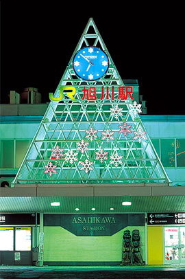 道央の中心都市で、道東・道北への拠点でもある旭川駅。駅舎入口は電飾が輝く三角形のモニュメントで飾られ、四季ごとに雪の結晶の色が変わります。