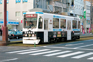 で、翌日さっそく鹿児島中央駅から指宿枕崎線につたって歩き始める。線路は市街地では市電と並ぶようにして走っている。市電はいろんな広告塗装が施されていて面白い。中でも、上下が白黒に塗り分けられ「まるでパトカーみたいだな」と思ったら、本当に鹿児島警察署の「生活安全号」だった。