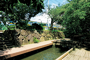 まわりを遊歩道に造り込んだ小さな川が現れる。木陰に入ると涼しい。説明看板があり「二ケ領(にかりょう)用水竣工400年記念」と書いてある。慶長14年(1611)から地域の農民が協力してなんと14年かけて造った用水で、米の収穫量を大幅に伸ばしたそうだ。今はどこにも水田は見えない。水辺に降りる道もあり、石に座って休んでいる人もいる。いい遊歩道。すぐそこに南武線が通るのも見えた。川崎市緑化センターの門が開いている。奥に大きな温室も見える。川の向こう側は川に沿った細長い、結構広い公園になっているようだ。