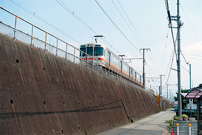 このあたりは線路が高架になっていて、その下を両側歩ける。早くも日差しが強くなってきたので、西側を歩く。日陰は風があって涼しい。高架線は、セメントで固められた土手(築堤と呼ばれるらしい)の上の線路になった。前から列車が来たのでパチリ。今日はたくさん撮れそうだ。本数が多いんだろう。