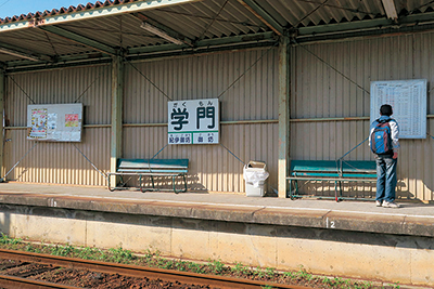 壁には昔のこの駅のモノクロ写真が貼ってある。昭和30年のホームには、大人から子供までのたくさんの利用客が電車を待っている。夏であろう、みな白い半袖シャツを着ている。駅のトタン屋根はうねっていて、土壁も剥がれ落ちており、すでに今よりボロい。でも駅には活気に満ちて見える。まだ世の中が車社会になる前だ。