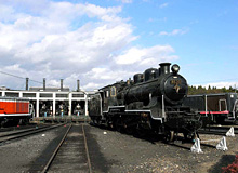 展示場を出るとすぐ、機関庫の前に出る。この機関庫は「扇形庫」といわれ、この扇形車庫は、大正3年(1914)に建設された現存する最古の鉄筋コンクリート造りの建築物だ。平成16年には、庫内の電動天井クレーン、引き込み線と共に、国の重要文化財に指定され、土木学会選奨土木遺産にも認定された貴重な産業遺産でもある。機関庫のなかには20線の引き込み線があり、保存機関車がここで保守点検を受けている。車庫内の静態保存機関車には、実際に運転台に乗れるものもある。