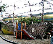 昭和45年に、運河を埋め立てて造られた公園。山手線沿いに位置し、山手線はもちろん東海道新幹線や京浜東北線、東京モノレールをすぐ間近に望むことができる。上れば新幹線が見やすくなる大きな船の木製遊具や、噴水のあるジャブジャブ池など、子どもを飽きさせない施設もいっぱい!