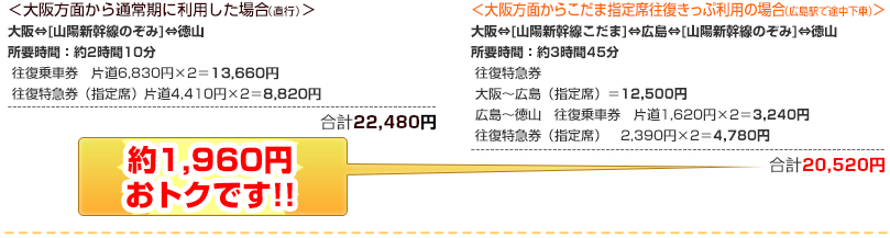 山陽新幹線内設定区間の「こだま号」および、一部「ひかり号」の普通車指定席が往復で利用できます。
