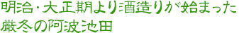 阿波池田は、北は阿讃の山々、南は剣山山系に抱かれた盆地。冬は新潟並みの寒冷地となり、盆地特有の気候が酒造りを支えている。