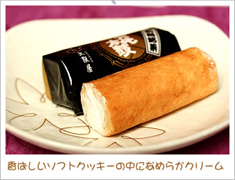 生地を木の年輪状に焼き上げたバームクーヘン状の軟らかな円筒形クッキー、その中にクリームを詰めた粋な洋風菓子です。