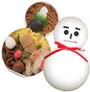 眉毛と鼻が動くかわいい表情の雪だるま型容器は食後に貯金箱になるすぐれもの。頭の部分はコシヒカリのご飯に鶏そぼろとシイタケの煮物を、おなかには鶏肉の照り焼き、味付きカズノコ、山菜など山海の幸を彩りよく詰めています。