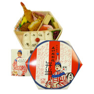8月末までの限定品(予定)。淡泊な太刀魚にユズの香りを付けて丁寧に焼いた太刀魚柚庵焼、クラゲと大根の和え物、夏野菜(ナス・カボチャ・アスパラ)の煮物など、料亭さながらの料理が二段折詰に盛ってあります。
