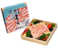 「元祖かに寿し」の幕の内版。カニは工場近くの漁港で揚がったものをすぐに茹で、手作業で一本ずつ殻をむいた後、独自の甘酢につけます。酢飯は寿司用に配合した鳥取県産米を丸釜で炊き、特製の酢を合わせます。おかずは牛のしぐれ煮、赤魚の竜田揚げなど。