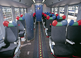 車体内外は外部デザイナーによるもので、セルリアンブルーメタリックの先頭部とステンレスボディのシャープでメタリックな外観で大きく注目されました。また客室は、動物の耳をあしらったようなヘッドレスト付きシートが採用されるなど楽しい演出も行なわれました。普通車にはグループで利用できるガラスで仕切られたセンターブースがあり、グリーン車は電動リクライニングシートで本皮張りの豪華な客室です。グリーン車運転台後部には木製ベンチのあるパノラマキャビンが備わり、ゆったりと前面展望が眺められます。