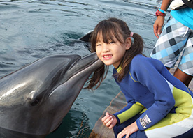 四角い枠のイケスを海に浮かべ、その中でイルカと遊ぶ「ドルフィンファンタジー」。見学(525円)・触れ合い(3500円)・スイム(1万500円)コースがある。イルカが空高くジャンプする姿も、すぐ目の前で眺められ、可愛いイルカたちに魅了されること間違いなし。