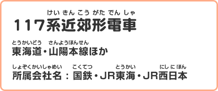 国鉄時代(こくてつじだい) の1979 年(ねん) 、 京都(きょうと) ~ 大阪(おおさか) ~ 神戸間(こうべかん) を 中心(ちゅうしん) に 運転(うんてん) されていた「 新快速(しんかいそく) 」 用(よう) として 開発(かいはつ) された 電車(でんしゃ) です。それまで「 新快速(しんかいそく) 」には 急行形電車(きゅうこうがたでんしゃ) が 使(つか) われていましたが、 専用車両(せんようしゃりょう) として117 系(けい) が 開発(かいはつ) されたのです。 出入(でい) り 口(ぐち) は 片側(かたがわ) 2つですが、 両開(りょうびら) きで 乗(の) り 降(お) りもしやすくなりました。 近郊形電車(きんこうがたでんしゃ) として 使(つか) いやすかったので、その 後(ご) 、 活躍路線(かつやくろせん) を 拡大(かくだい) しています。