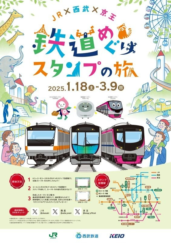 東日本旅客鉄道株式会社八王子支社、西武鉄道株式会社、京王電鉄株式会社は、1月18日(土)から3月9日(日)まで、3社合同イベント「鉄道めぐりスタンプの旅」を実施しています。