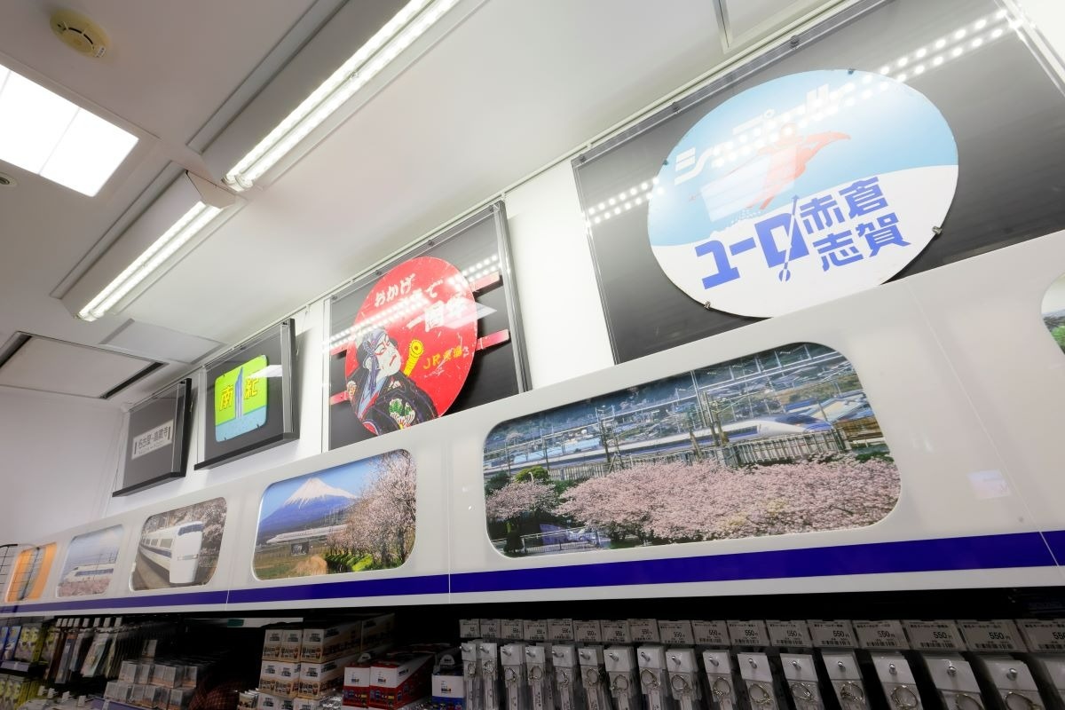 店内にはリニア・鉄道館収蔵のヘッドマークを展示。東海道時代だとわかるグリーン車を連結した500系の写真にもご注目!