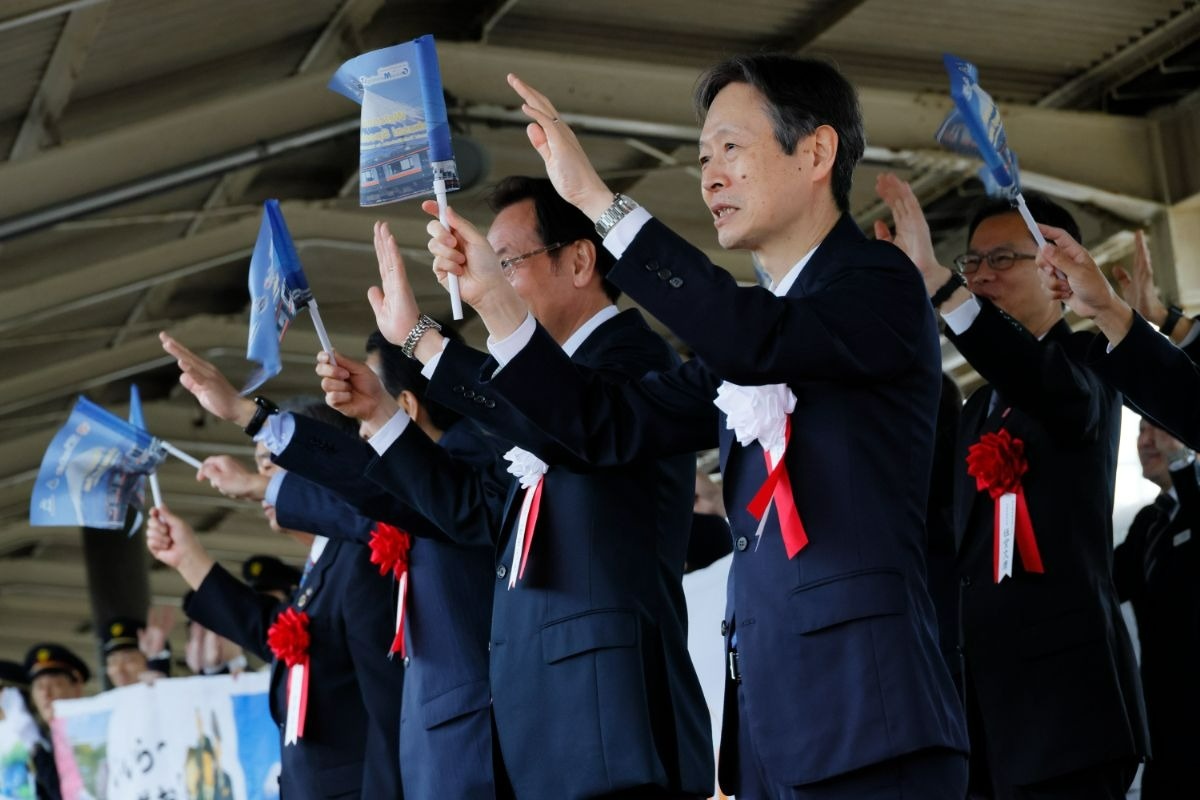 三島駅長による出発合図。専用列車には315系4両が使用され、車内には葛飾北斎の絵画が飾られている