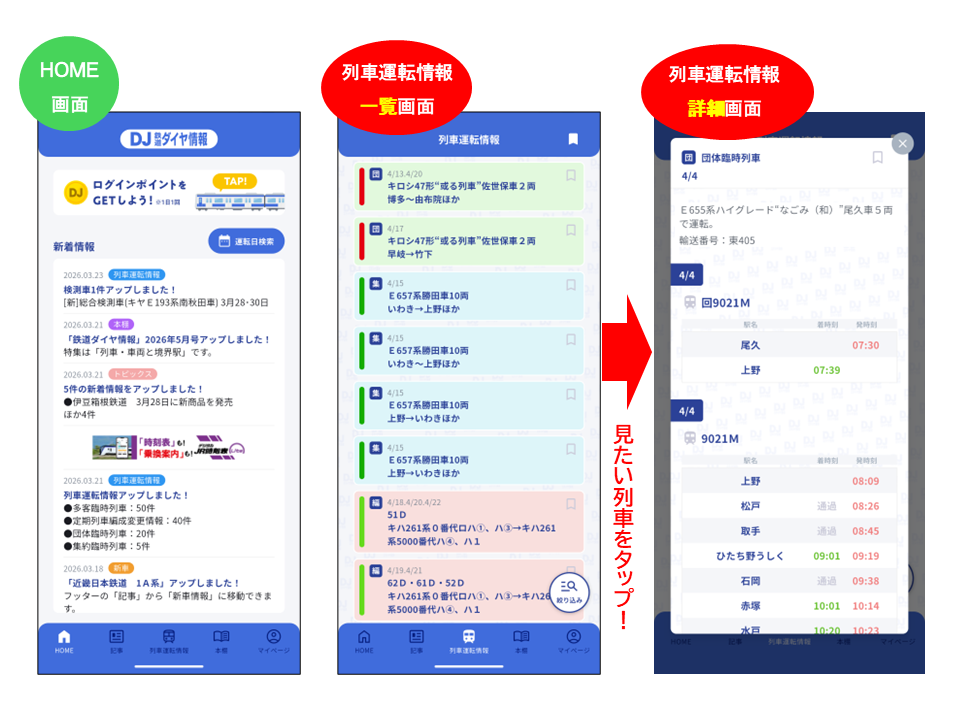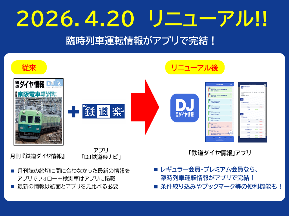 旧アプリ「DJ鉄道楽ナビ」では、月刊『鉄道ダイヤ情報』の締切後の追加・変更情報を中心に公開してきましたが、「鉄道ダイヤ情報」アプリでは、本誌掲載の多客臨時列車、団体臨時列車、定期列車の編成変更情報を全件網羅するほか、引き続き締切後の追加・変更情報もフォローします。