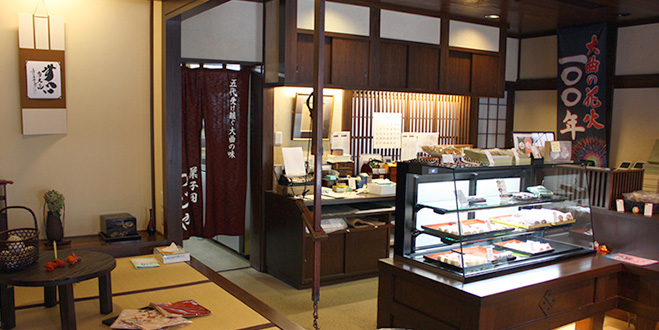 JR大曲駅前にある昭和10年(1935)創業の老舗菓子店。お菓子だけでなく、「大曲の花火」関連のグッズも店内に並ぶ