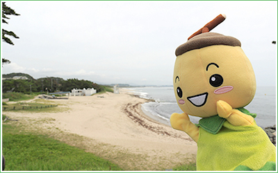 日立市の歴史を学んだきのぽんが、次に訪れたのは「日本の白砂青松(はくしゃせいしょう)100選」に選ばれた「伊師浜(いしはま)海水浴場」だ。