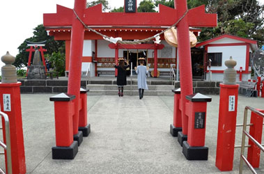 薩摩半島の南側、海へ小さく突き出た岩礁の上に鎮座する同神社。古くから、武士道や勝負の神様として畏敬されてきた。戦前は「釜の蓋や鍋を持ったり被ったりして神様に祈願すると、敵弾が当たらない」との言い伝えが広がり、多くの出兵者や家族が参拝に訪れたという。最近は芸能人やスポーツ選手も訪れるパワースポットとして有名で、釜の蓋を頭にのせて落とさずに鳥居から拝殿まで歩くことができれば、願いが叶うとも! 本殿右には霊石が鎮座しており、撫でながらお祈りすると、子宝・安産に恵まれるといわれている。神社裏から望む大海原と開聞岳の絶景もお見逃しなく。