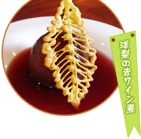 「アフォガード」とは、冷たいアイスクリームにエスプレッソなど熱々のコーヒーをかけたデザート。カフェテラス絵麗顔都(エレガント)で12~5月に味わえる「イチゴのアフォガード」は、世羅産のイチゴを使用しているのが特徴で、チョコレートとイチゴの香りのミスマッチがあとひく美味しさ! 生クリームの上には白鳥に見立てたパイが添えられ、器とともに優雅な気分にさせてくれる逸品だ。10~11月に登場する「洋梨の赤ワイン煮」は、フランス伝統のレシピにより、世羅産のラ・フランスと赤ワインでじっくり仕上げたジュエリーのようなひと品。大きめに添えられたパイの飾りが色彩と味のアクセントとなっている。季節の素材を活かし、繊細に手をかけられたデザートは、お宝と呼ぶにふさわしい。