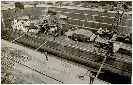 昭和17年、大破した駆逐艦(くちくかん)「不知火(しらぬい)」の損傷・復旧状況を撮影する工廠員の様子