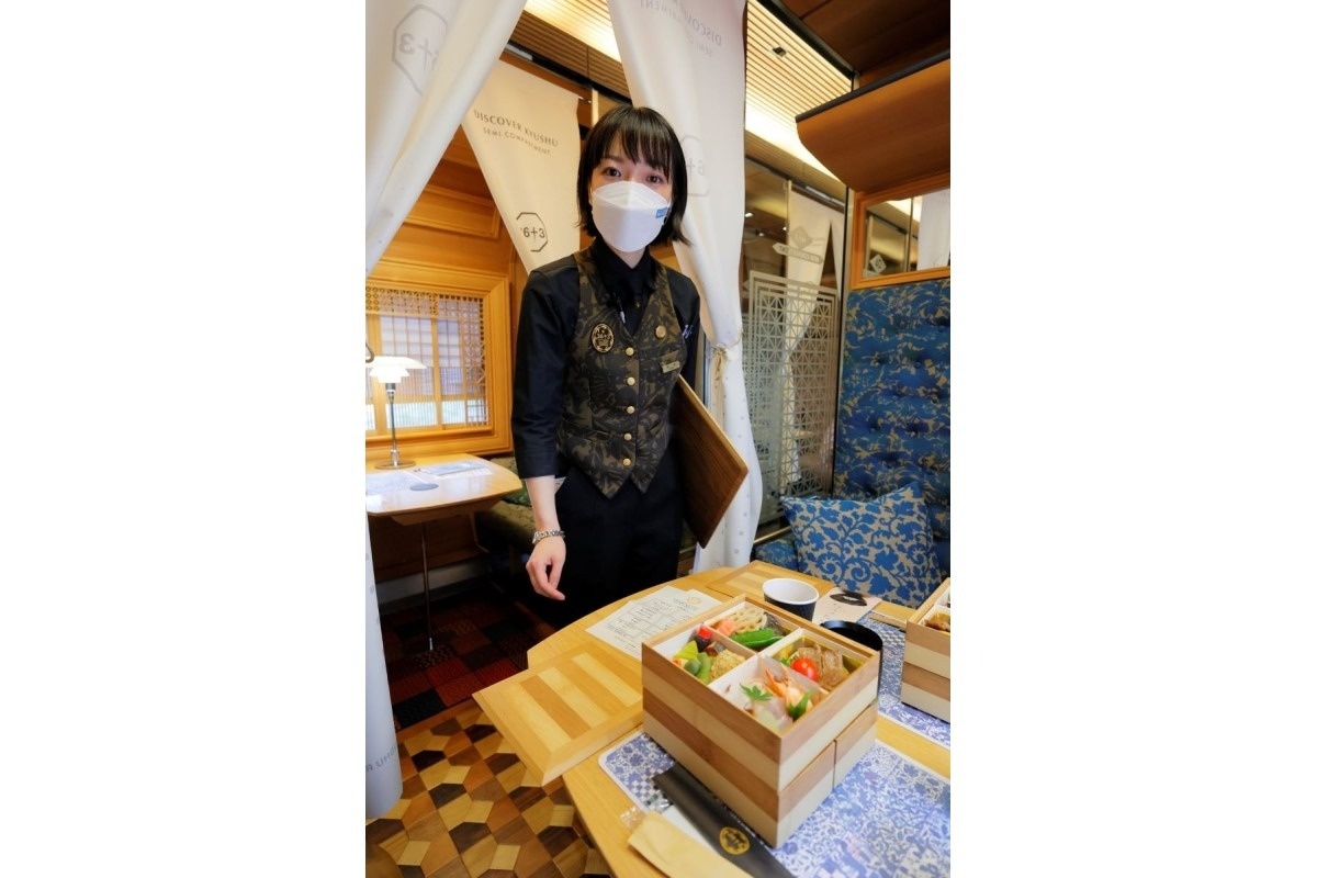博多駅に停車しているときから圧倒的な存在感を放つ「36ぷらす3」。たくさんの人にお見送りしていただきながら博多駅を出発すると、しばらくして、さっそくお楽しみのランチタイム!往路便では座席・個室それぞれにこの列車でしか味わえない食事が楽しめる「ランチプラン」が設定されています。