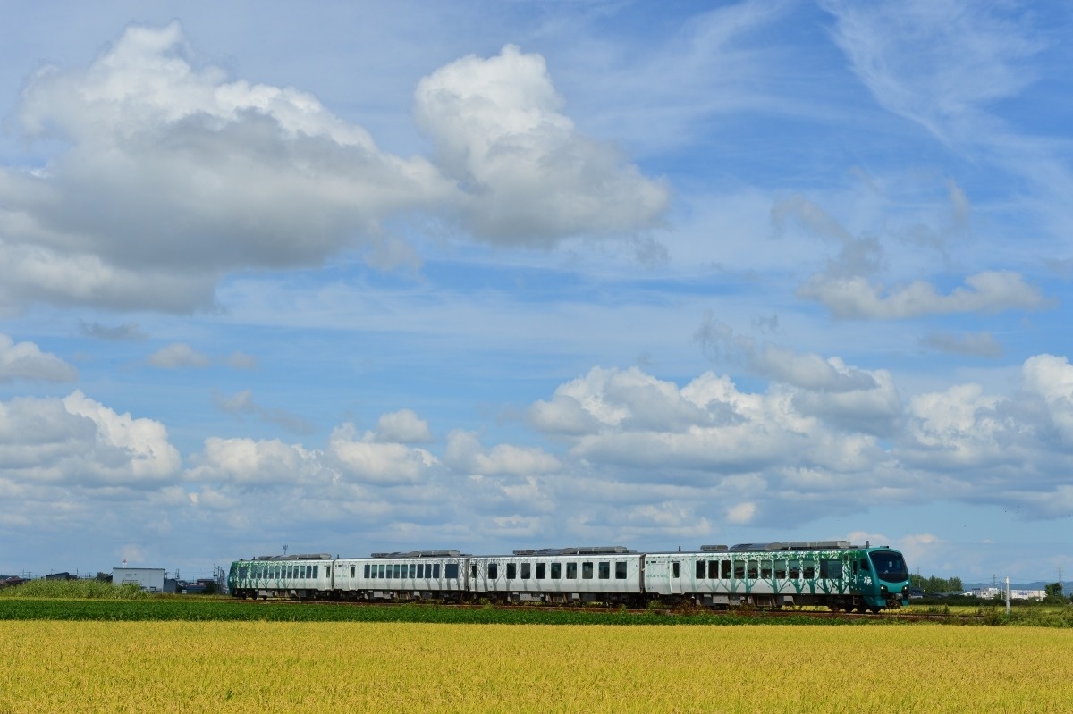 鰺ケ沢を発車すると、ようやく日本海とお別れです。ここからは津軽平野の旅となり、中田駅からは左右に広大な水田が広がります。