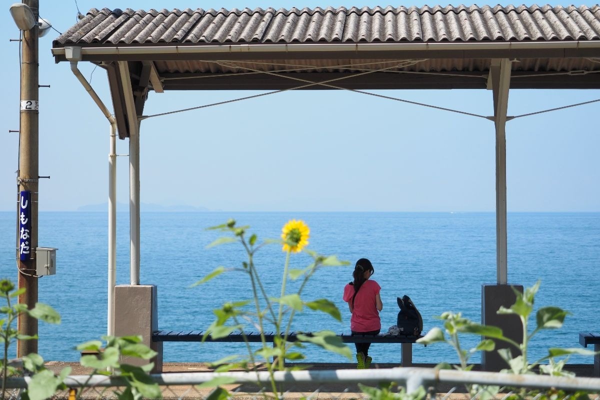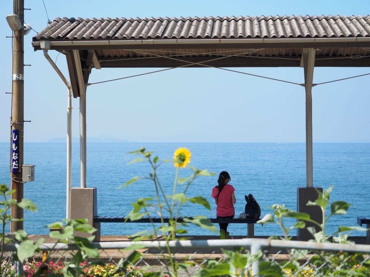 ホームから伊予灘ののどかな風景を見晴らせる絶景の無人駅で、〔伊予灘ものがたり〕もここでしばらく停車します。ただし、休日は観光客で大変混雑するので、ゆったりと訪れるのなら平日がおすすめです。夏なら、19時前後に伊予灘へ沈む夕陽を眺めることもできます。