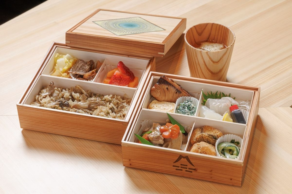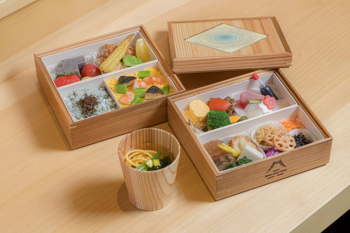 日田杉を用いたオリジナルのお重を開けると、地元食材をふんだんに使い名店の料理人が仕上げた独自メニューが。
