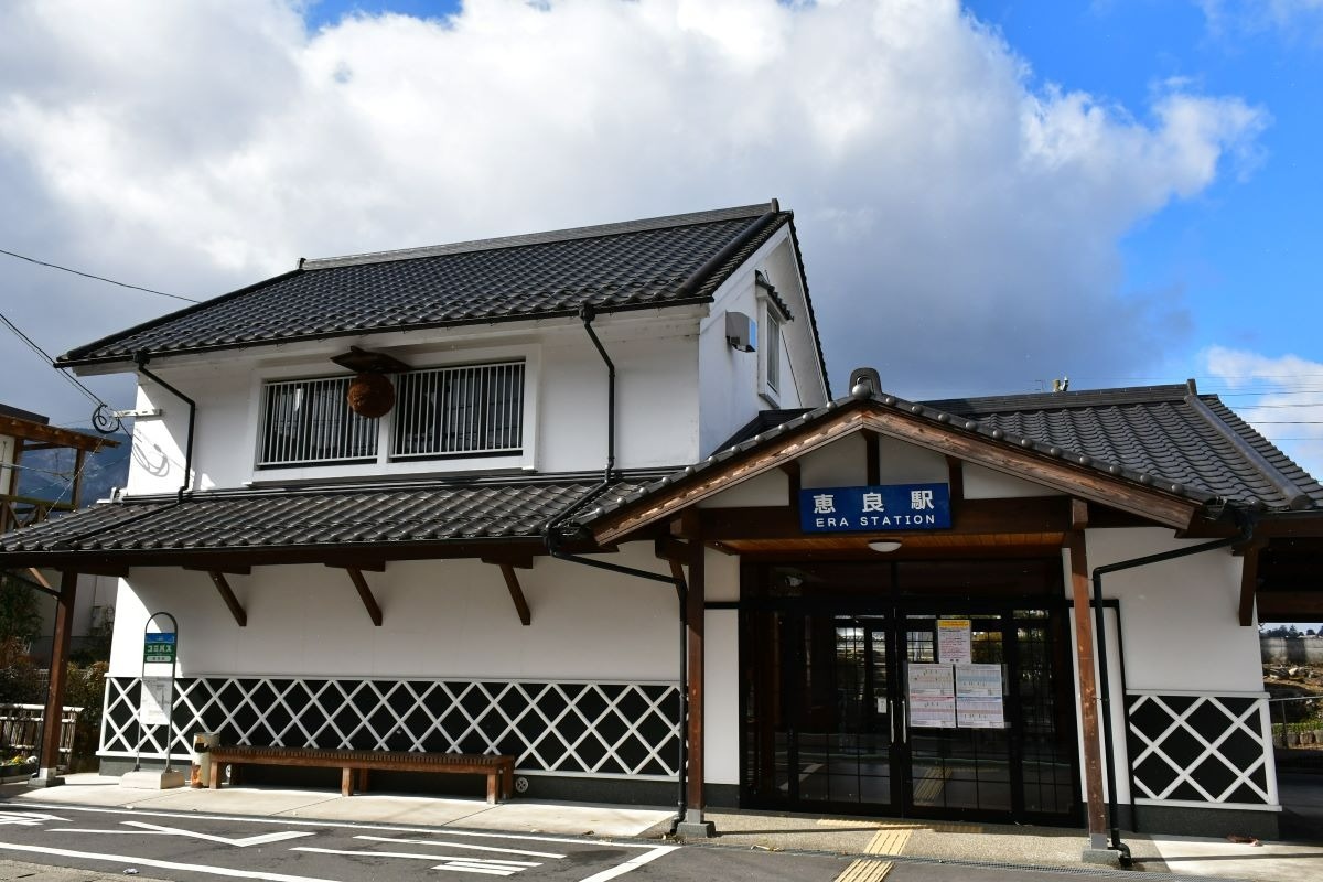 麻生家の資料展示がある恵良駅では八鹿酒造のおもてなしも。