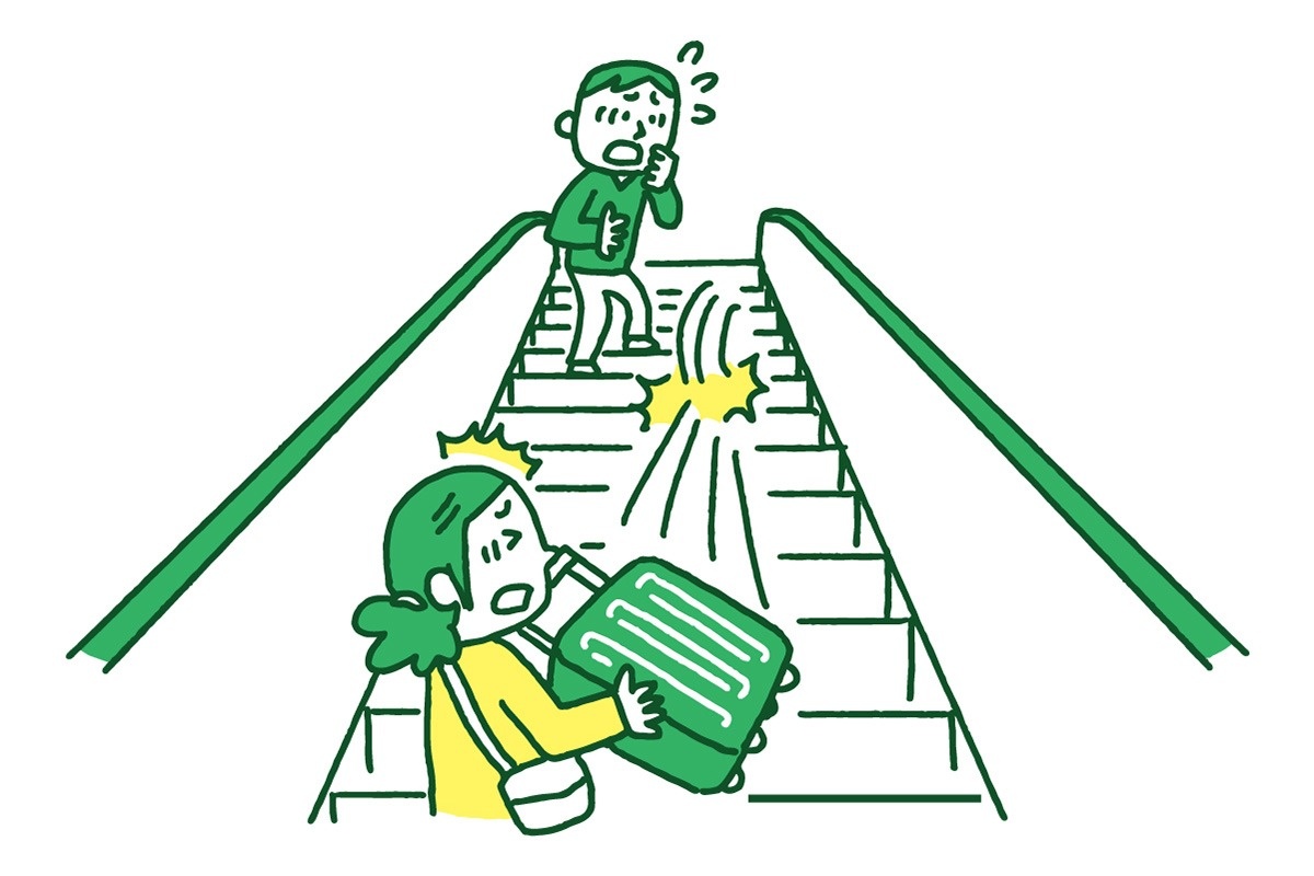 エスカレーターに乗るときは、大人と手をつなぐか、手すりにつかまるようにしましょう。大きな荷物があるときは自分の後ろの段か、前の段に置くようにして、落とさないようにしっかりと持ちましょう。エスカレーターの途中で荷物が落ちてしまったら周囲の人が怪我をするような大きな事故になってしまうので気をつけましょう。また、エスカレーターは歩かず、立ち止まって乗るようにしましょう。動いている階段の上を歩くと、足を踏み外したり、前の人にぶつかったりして事故につながることがあります。