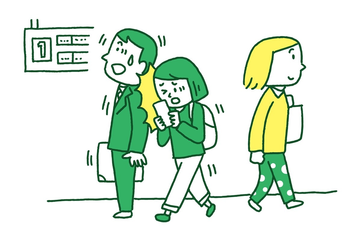 駅はたくさんの人が行き来し、電車に乗るために急いでいる人も多い場所です。そんな中でスマートフォン(携帯電話)の画面に夢中になってしまうと、前をよく見られなくなり、人にぶつかったり、つまずいたりしてケガをすることがあります。