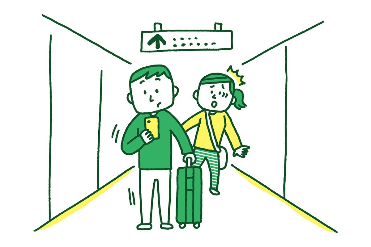通路は歩く人が優先です。なにかを確認したり、相談したりするときは通路の端により、通る人のためのスペースを確保しましょう。大きな荷物を持っている時も要注意です。荷物で通路をふさがないようにしましょう。