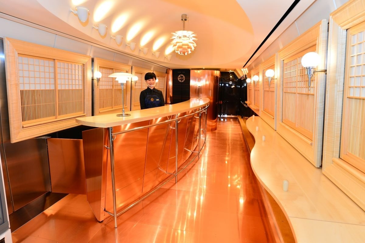 カウンターでは九州の美味しいもの、こだわりの匠の品を用意。また、カウンターの反対側には立食用のテーブルや椅子付きのテーブルがあり、流れゆく美しい車窓の風景を楽しみながら、グラスを傾けることもできます。