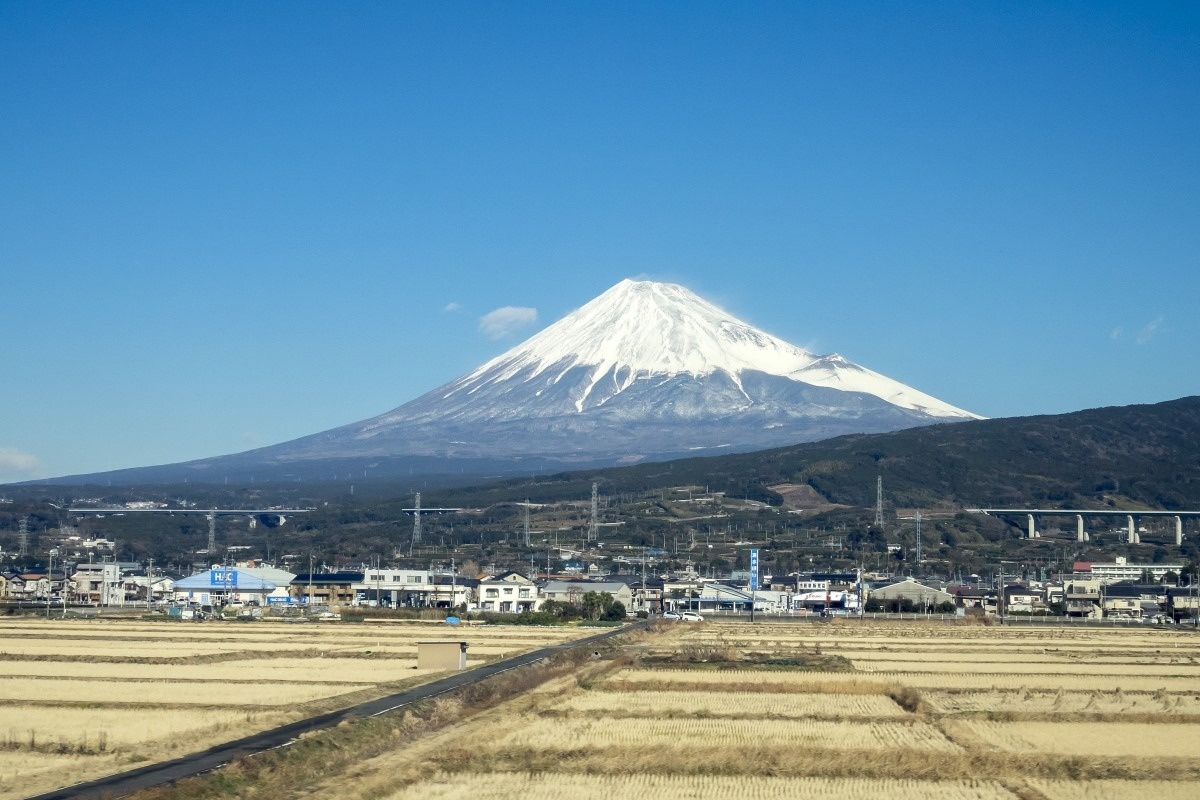 東海道新幹線から眺める富士山は格別です。ハイライトは何といっても新富士駅付近。「のぞみ」下り列車の場合、三島駅を通過して約4分後、E席側の茶畑が急に遠ざかって、愛鷹連山の陰から富士山が裾野まで見えてきます。