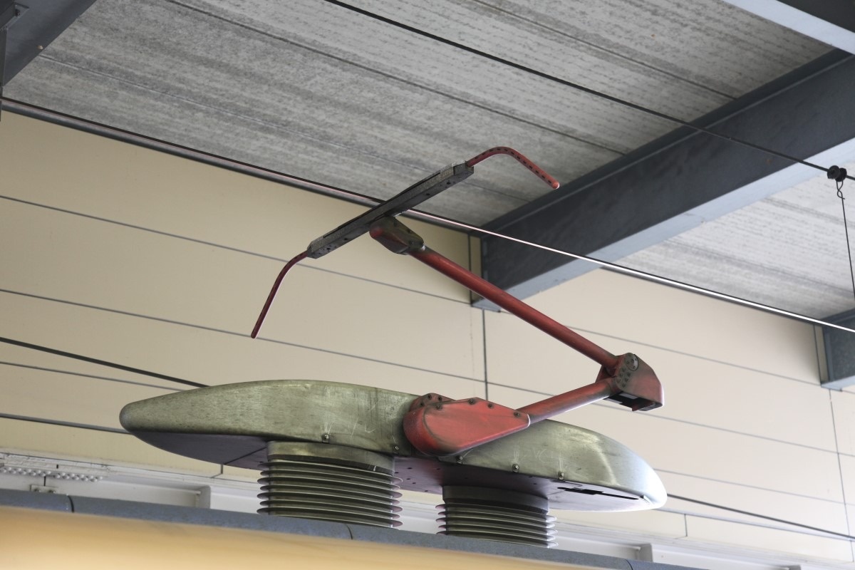 小型軽量のシングルアームパンタグラフ。最高速度が260km/hとそれほど速くないため、左右の防音カバーは省略された