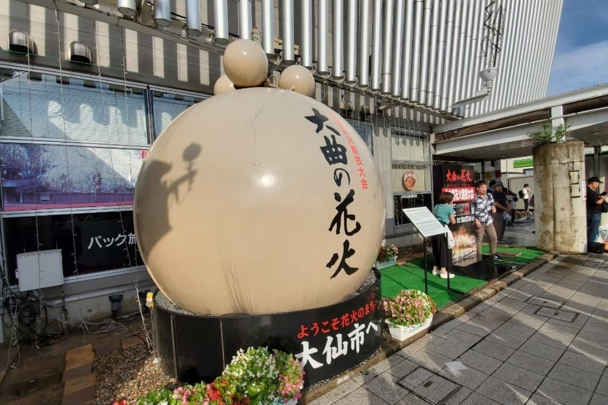 駅舎を出てすぐのところに設けられているのは「大曲の花火」と書かれた、直径3メートルほどはあろうかという巨大な花火玉モニュメント。で、でかい…。
