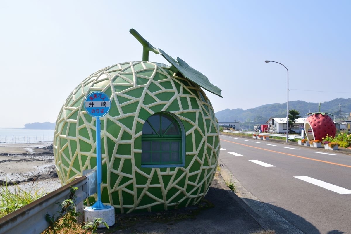 また、駅つながりでバス停もメルヘンチック。なんと、小長井駅の近くにはフルーツの形をしたバス停があるんです!