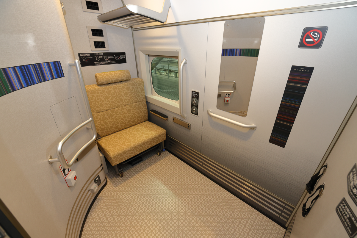 座席の張地の柄は号車ごとに異なり、1号車は「菊大柄」、2号車は「獅子柄」、3号車は「唐草」となっています。張地に座った時に滑らず、体によりフィットする工夫を施すなど、高級感とくつろぎを実現しています。なお、座席配置は2+2席で、ゆったりとしています。