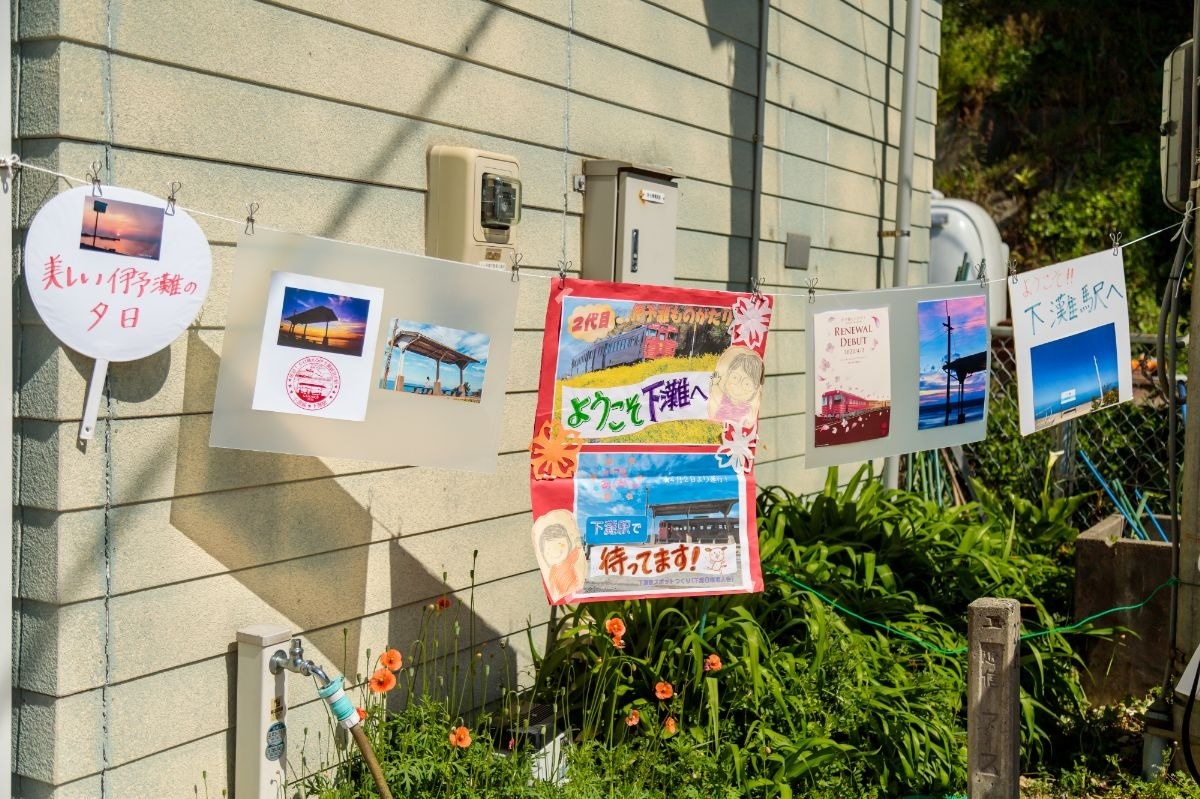 下灘駅のかたわらには歓迎するメッセージカードも