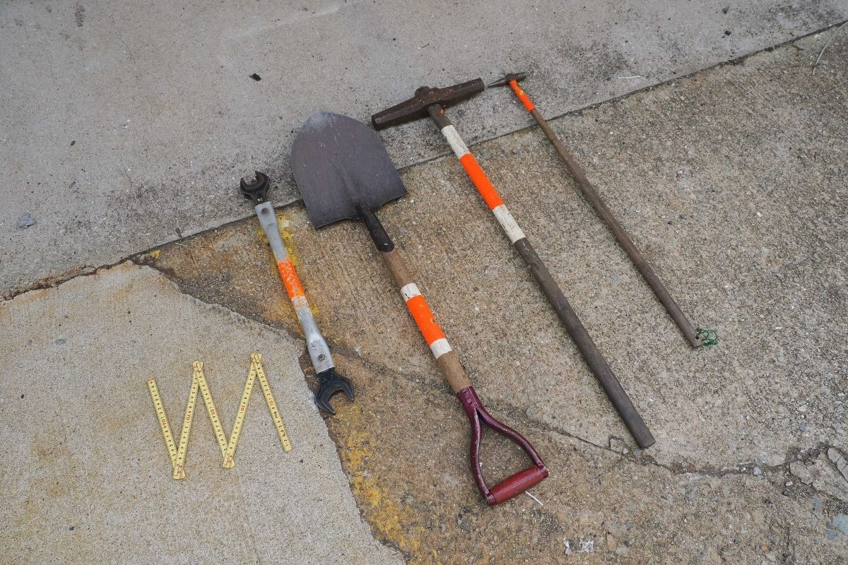 徒歩巡回に欠かせない道具たち(左から折り尺、スパナ、シャベル、スパイキハンマー、ハンマー)。保線の道具は重い道具が多いそう