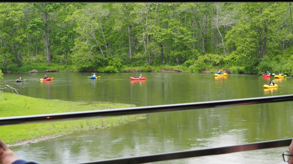 戻りも2号車に乗車です。運よく指定の取れたベンチシートに座り、定刻の12時17分に塘路駅を出発。早速一番の見どころ・最接近する釧路川を迎えます。そこでは往路はいなかったカヌーを楽しむ一団に出会うことができました。列車内から手を振り、カヌーからも手を振り返すなかなか貴重な光景から復路の旅は始まりました。