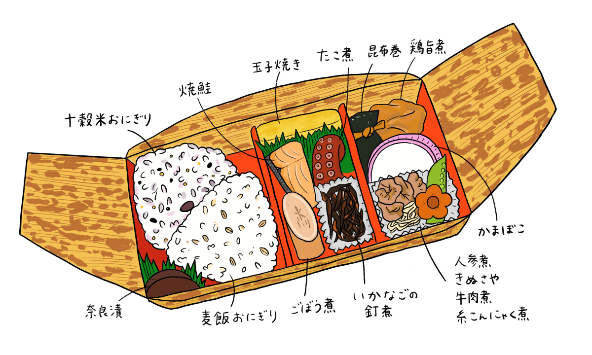 十穀米と麦飯の紅白のおにぎりと幕の内の三種の神器とされる焼鮭・かまぼこ・玉子焼きが入ったコンパクトなお弁当。すきやき風味の牛肉煮やたこ煮が加わり、山海の幸を一緒に楽しめる。何よりご当地らしさを感じさせてくれるのは「いかなごの釘煮」だ。兵庫には春先、我が家で炊いた釘煮を近所に配ったり、遠方の知人に贈ったりする習慣があるという。昨今はいかなごの不漁のため食文化の継承が危惧されているが、その土地の暮らしを思い浮かべて、ご飯と一緒に甘辛な釘煮を噛みしめると味わい深い。実用的でしっかり旅情を感じられる。これぞ「駅弁」だ。