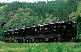 2004(平成16)年3月13日の九州新幹線開業に合わせて、鹿児島中央から霧島方面へのアクセス用に誕生した列車が特急「はやとの風」。目を引く漆黒の車両は一般形気動車として製造されたキハ40系を改造したものです。車体の中央部には天窓を備えた展望スペース。木製のカウンターテーブルがあり、ベンチに座って車窓に広がる風景を楽しむことができます。また、座席は2列ずつの回転式リクライニングシートで、床や仕切り壁には難燃加工をした木材を使用しています。