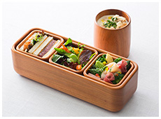 九州の旬の肉・魚・野菜を使用した東京・南青山のレストラン「NARISAWA」の技が詰まった弁当。スープとともに旅のはじまりを楽しめる。