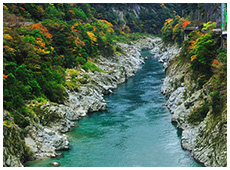 結晶片岩が水蝕されてできた奇岩怪石が造りあげた険しい渓谷。春は桜・新緑、秋は紅葉が清流に映し出され、絢爛豪華な絶景が楽しめる。
