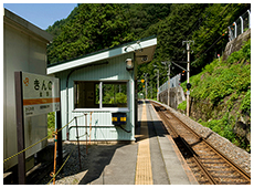 田本駅と同様に集落から離れた場所に設置された駅。周辺には人家もなく、駅前には細く曲がりくねった道があるだけで秘境感が漂っている。