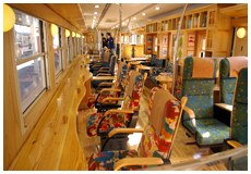 客船やヨットに用いられるチーク材を使用したインテリアの1号車。リクライニングシートと海側に向いた回転腰掛けや本棚を設置。